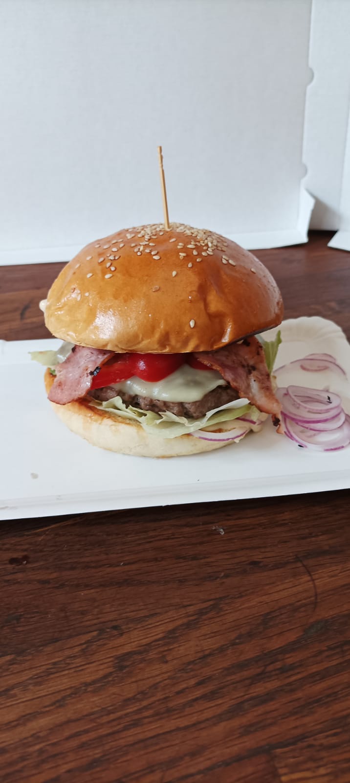 Domácí hovězí burger : hovězí maso, 2 druhy omáčky, rozpečená uzená krkovice, sýr gouda, červená cibule, ledový salát, rajče, okurka, paprika, bulka z domácí pekárny
